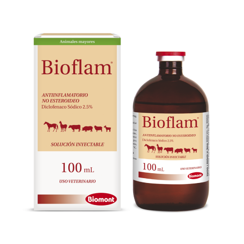 BIOFLAM está indicado para el tratamiento sintomático de la inflamación, fiebre y dolor asociadas a patologías del aparato respiratorio (bronquitis, neumonía), aparato genitourinario (vulvovaginitis, salpingitis, metritis, pielonefritis, cistitis, vesiculitis, epididimitis), de la glándula mamaria (mastitis), patologías musculoesqueléticas y de las articulaciones (cojeras agudas y crónicas, tendinitis, desmitis, miositis, artritis, artrosis, espondilitis, espondiloartritis, síndrome doloroso de la columna vertebral). Posee actividad miorrelajante sostenida y buena tolerancia.