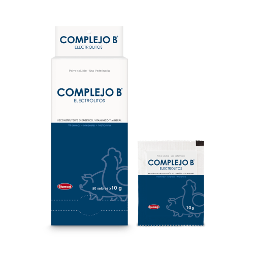 COMPLEJO B ELECTROLITOS es es un suplemento nutricional formulado a base de electrolitos, vitaminas y metionina que intervienen en las reacciones metabólicas indispensables para el correcto funcionamiento fisiológico de los animales. Está indicado como: