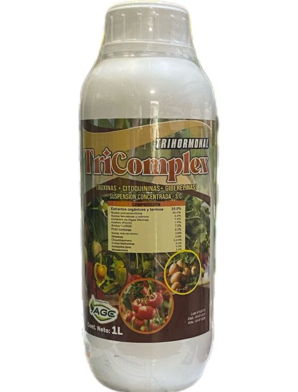 TriComplex, es un regulador de crecimiento TRIHORMONAL (auxinas, citoquininas, giberalinas) enriquecido con aminoacidos policarboxilicos, algas marinas, microelementos, acidos fulvicos y proto hormonas naturales, estraidas por procesos de fermentacion a partir de extractos vegetales.